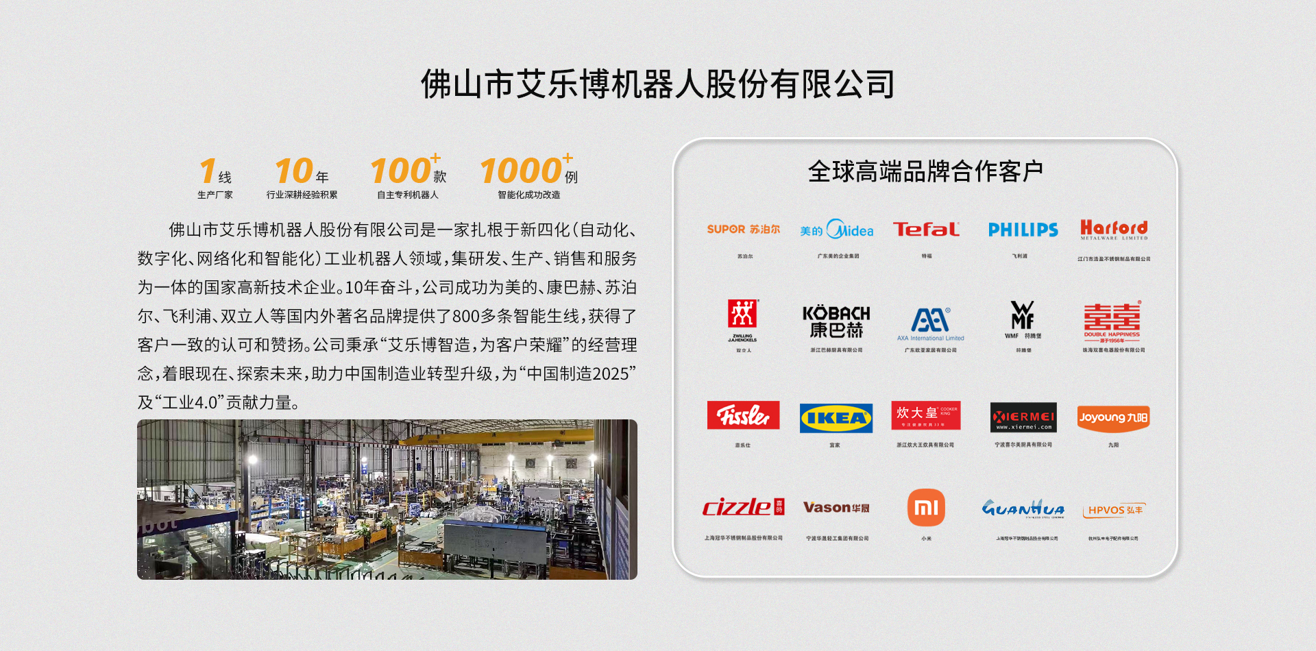 自動化定制服務 - 佛山市艾樂博機器人科技有限公司,是一家專注不銹鋼鍋、鋁鍋、壓力鍋、電飯鍋及不銹鋼水壺等自動生產線機器人研發、生產、安裝一體的高科技企業,已經成功為美的、蘇泊爾、九陽、雙喜等家電集團完成鍋具產線布局。
